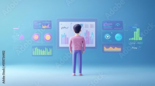 Digital illustration of a person analyzing data displayed on futuristic charts. Concept of technology, statistics, and business analytics.