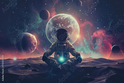 Digital illustration of a tranquil cosmic meditation space with ethereal planets Glowing energies And a serene astronaut in lotus position