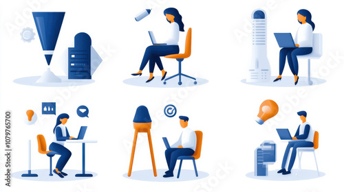 Digital illustrations of people working in various office settings, using laptops and engaging in creative tasks. scenes depict collaboration and productivity in modern workspace