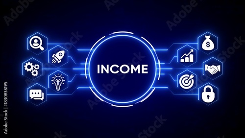 Digital income concept with glowing neon icons for business growth and success on dark blue background