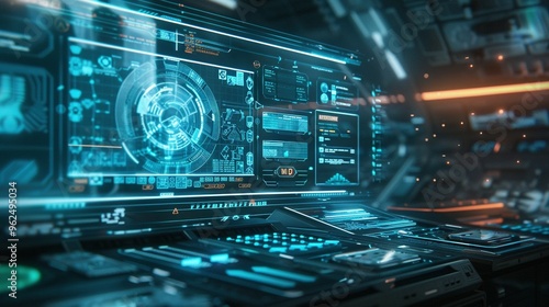 Digital Interface Featuring a Futuristic Command Prompt with a Holographic Computer Screen: Advanced Technology and Cybernetic Innovation