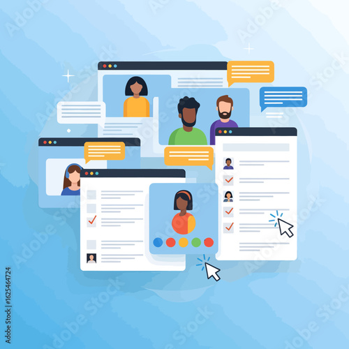 Digital interface for online team collaboration with diverse user profiles chat bubbles and task checklists.