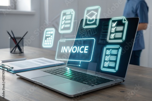Digital Invoice Concept on Laptop Screen in Modern Office Workspace