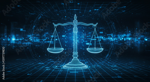 Digital Justice Scales Wireframe Model of Scales of Justice in a Futuristic Data Background