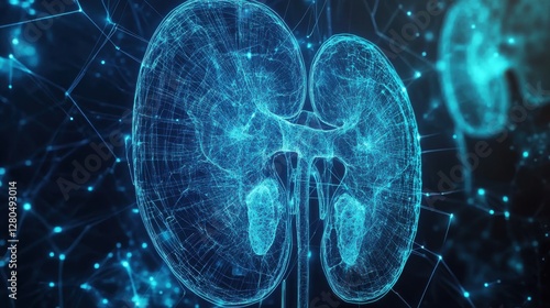 Digital Kidney Blueprint: A futuristic, digitally rendered blueprint of human kidneys, showcasing the intricate network of vessels and structures in a mesmerizing display of medical technology.