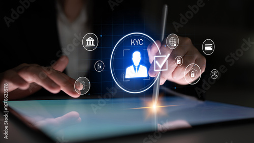 Digital KYC verification with biometric scan, ID authentication, and financial security icons representing identity verification, secure onboarding, fraud prevention, and compliance Latch