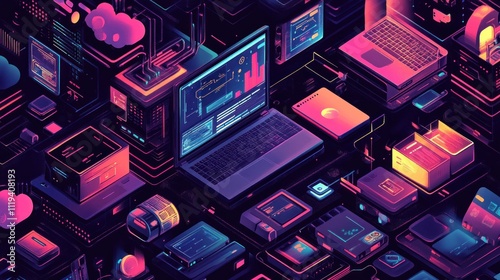 Digital landscape with laptops and tech elements