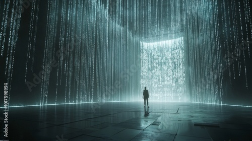 Digital Liberation - Ray Tracing 3D Illustration with Code Waterfall and Cinematic Lighting