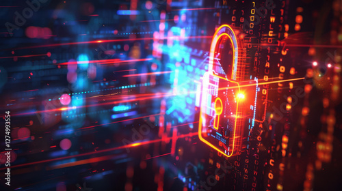 Digital lock symbol representing cybersecurity and data protection, surrounded by vibrant binary code and glowing lines, conveying sense of security and technology
