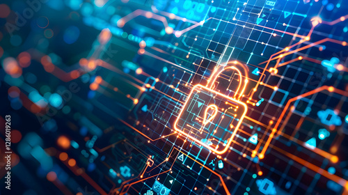Digital lock symbolizing cybersecurity amidst complex data network and technology backdrop