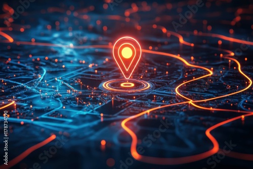 Digital map highlighting a location with glowing waypoint in vibrant blue and orange colors