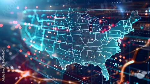 Digital map of USA, concept of North America global network and connectivity, data transfer and cyber technology, information exchange and telecommunication