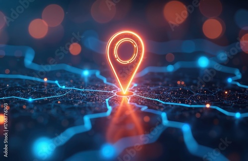 Digital map pin glows on futuristic background with glowing blue lines. Tech represents global positioning, navigation, location pinpointing. Digital tech theme. Concept for travel industry,