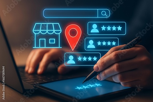 Digital mapping and online business presence user interacting with navigation and business listing interface