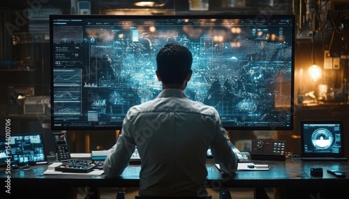 Digital marketing analyst using holographic dashboards, futuristic workspace, ambient lighting, sharp focus