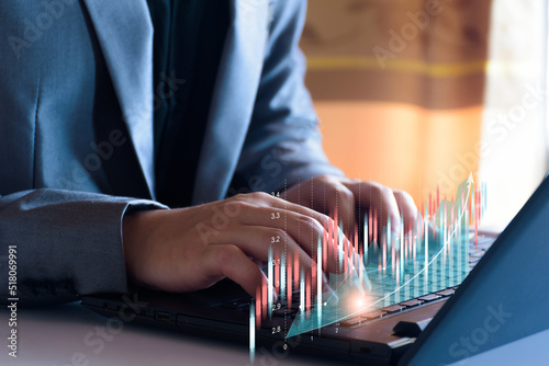 Digital marketing concept. Business man analyzing internet marketing online, business planning, online digital business, online stock market analysis, stock chart upward trend, digital stock trading.