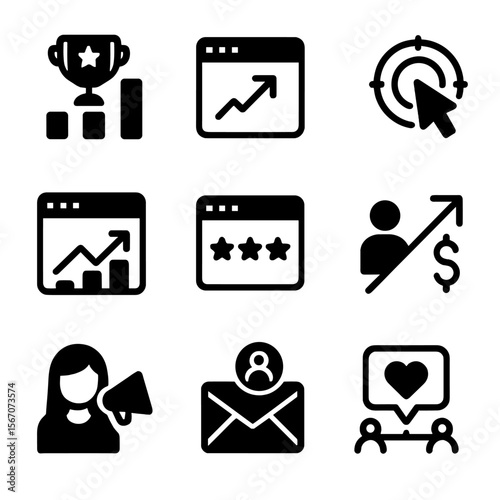 Digital Marketing Icons. Solid, filled icon set of digital market competition: website ranking, SEO icon, pay-per-click, web