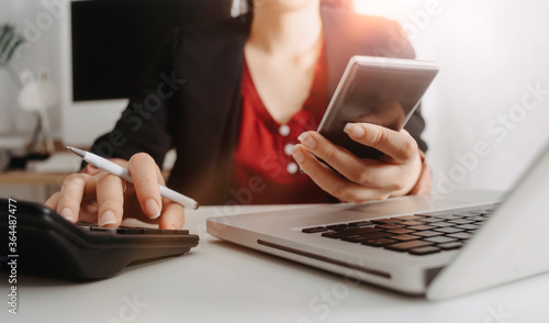 Digital marketing media in virtual screen.businesswoman hand working with mobile phone and modern compute with VR icon diagram at office in morning light