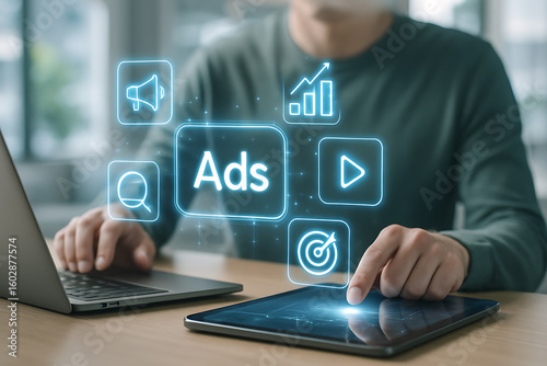 Digital marketing specialist using multi-device setup with glowing hologram ad icons for SEO, targeting, video promotion, and analytics strategy in a modern tech workspace