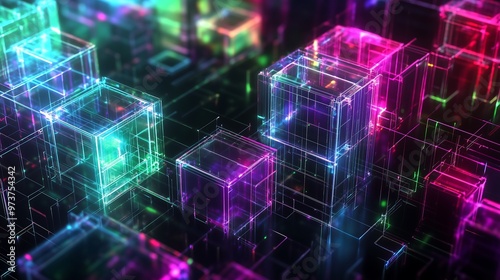 Digital metadata cubes and binary related designs, neon light fractal abstract technological background