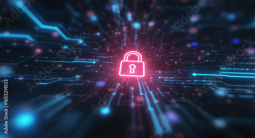 Digital network security visualization: A bright red padlock icon glows intensely amidst intricate patterns of blue light trails and data points on a dark, futuristic grid.