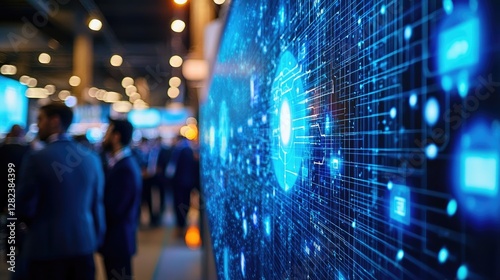 Digital Network Visualization with Abstract Blue Elements at a Business Conference Setting