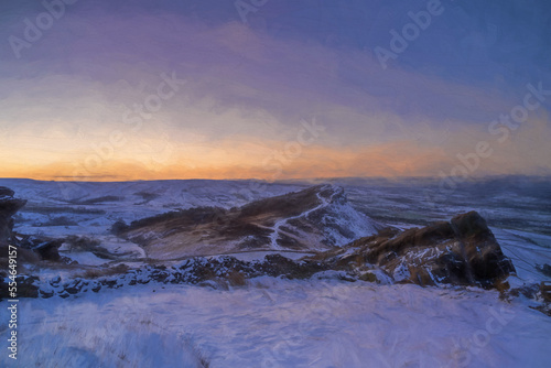 Digital painting of Hen Cloud winter sunrise and snow at The Roaches, Staffordshire.