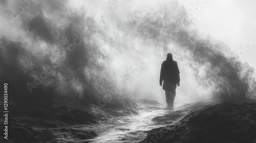 digital painting of man silhouette walking in the fog monochrome digital painting in black and white
