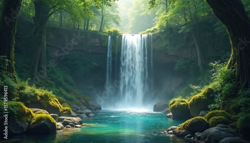 Digital painting of serene forest waterfall with green trees, turquoise water. Sunlight filters through canopy, illuminating moss-covered rocks, creating magical, tranquil atmosphere. Idyllic scene