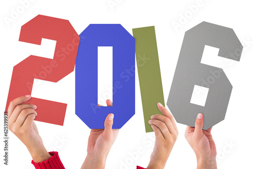Digital png illustration of hands holding 2016 numbers on transparent background