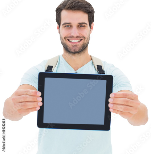 Digital png photo of happy caucasian man in backpack holding tablet on transparent background