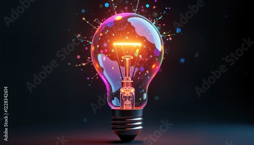 Digital rendering light bulb filled with abstract shapes, patterns. Colorful abstract patterns, shapes inside bright light bulb. New ideas concept. Visual representation complexity, depth. Innovative