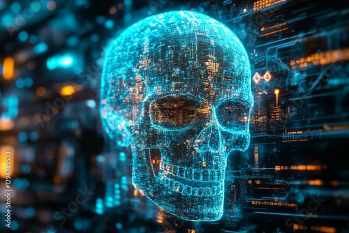 Digital representation of a glowing skull surrounded by vibrant data patterns in a futuristic environment