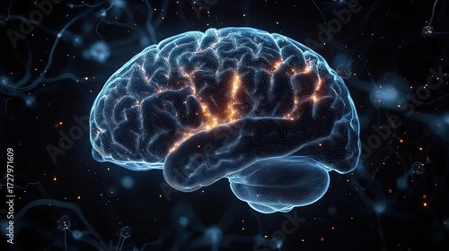 Digital representation of a human brain with illuminated neural pathways and glowing electric signals against a dark background conveying intelligence and complexity