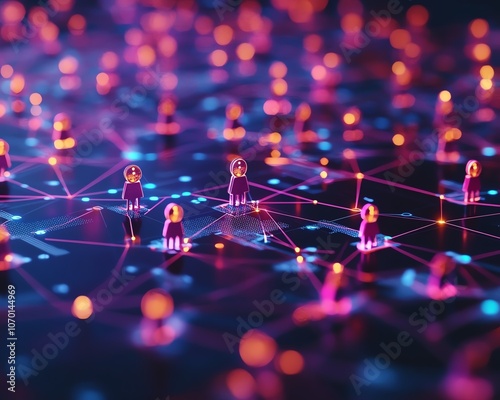 Digital representation of a network with interconnected figures, symbolizing different people and groups in the online world of communication and technology