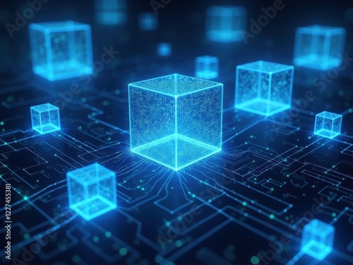 Digital representation of blockchain technology with glowing cubes connected on a circuit grid during night time setting