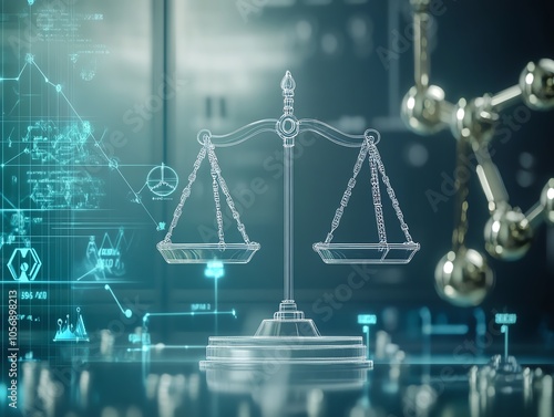 Digital representation of justice with holographic scales, symbolizing balance, security, and law in a futuristic technological setting.