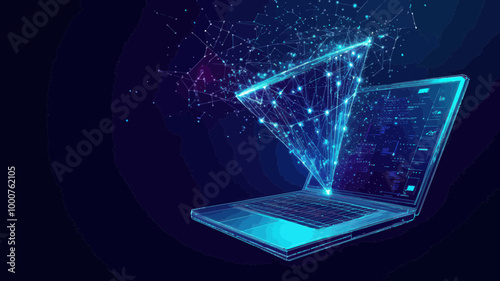 Digital Sales Funnel on Laptop with Big Data Flow in Technological Blue Background, Abstract Low Poly Wireframe Vector Illustration in Starry Sky Polygonal Style