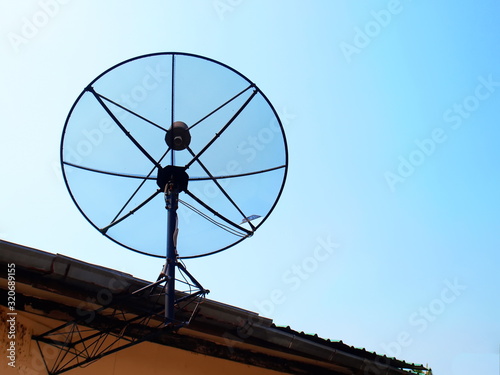 Digital satellite tv receiver A translucent television receiver on the roof or the antenna for space technology on a clear sky background. Broadcast from satellite With copy space