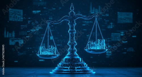 Digital scales of justice balancing cityscapes, representing data and equity.