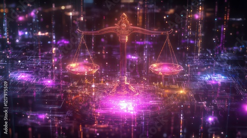 Digital scales of justice glowing in vibrant colors on a circuit board background.