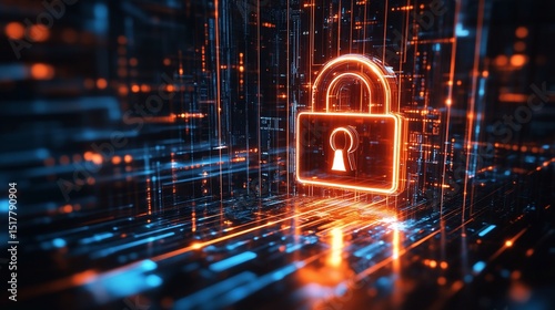 Digital Security Lock on Cyber Network with Glowing Data Streams and Lines