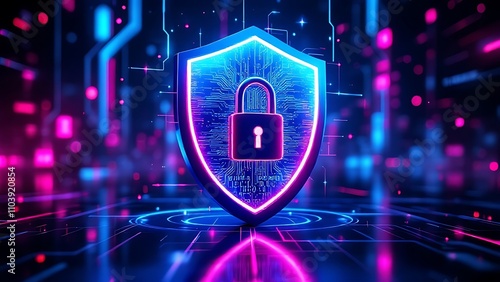 Digital shield symbolizing cybersecurity. This vibrant image showcases protection and technology in a futuristic setting, perfect for tech-related projects.