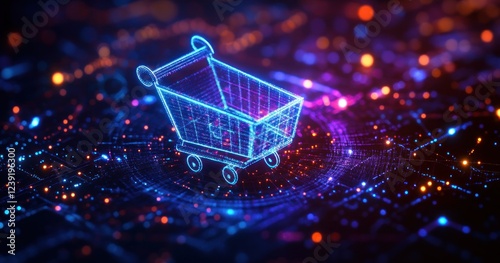 Digital Shopping Cart Icon in Cyberpunk Style for E-commerce and Online Retail