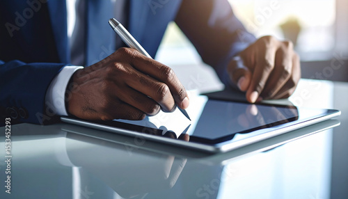 Digital Signature: An executive meticulously signs a digital document on a sleek tablet, reflecting the shift towards digital solutions and the modern workplace.