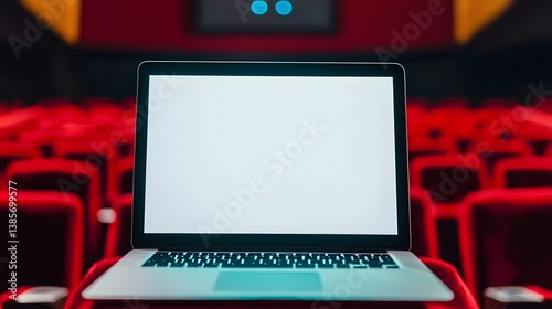Digital Stage: A modern laptop, with a blank screen ready for content, sits in the heart of a grand auditorium, inviting creativity and multimedia presentations.