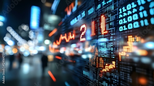 Digital stock market display with glowing numbers and graphs in blue and orange tones showing financial data and market trends against blurred city lights background.