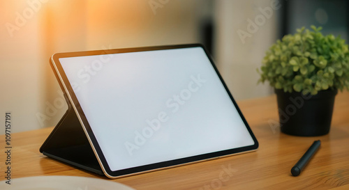 Digital tablet blank screen with stylus and plant on wooden desk in warm lighting