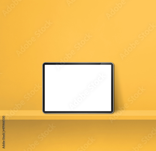 Digital tablet pc on yellow wall shelf. Square background banner