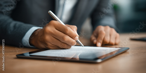 Digital tablet with stylus pen in hand showing remote workstudy spaces concept for business and education